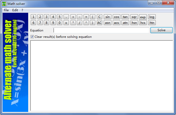 Alternate Math Solver数学解算器是一个程序来解决方程的变量X数学方程求解软件,它是基于aequartio(C)由H.埃克,求解的数学是学生在数学上得到帮助的最简单的方法。越来越多的学生和家长之间是一个证明效果又如何帮助学生获得数学帮助轻松有趣的方式。数学解算器是一个全面的外汇数学软件,基于自动数学问题解决发动机。