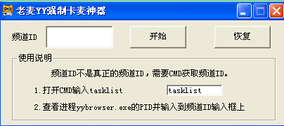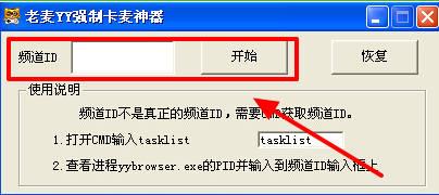 老麦YY强制卡麦神器是一款小巧免费的YY频道卡麦工具!打开工具,按照说找到真实频道ID,然后输入,点击开始!