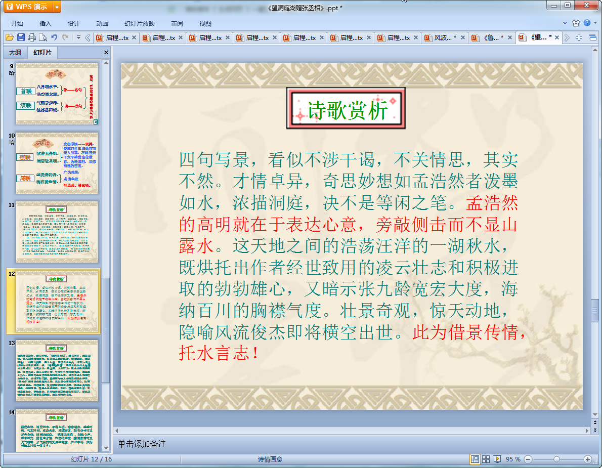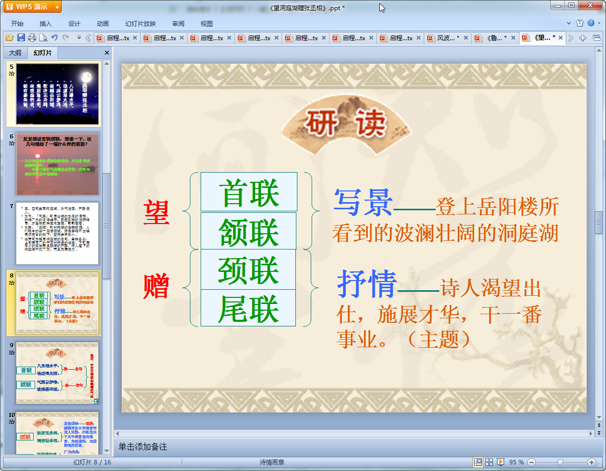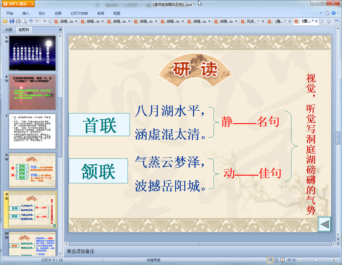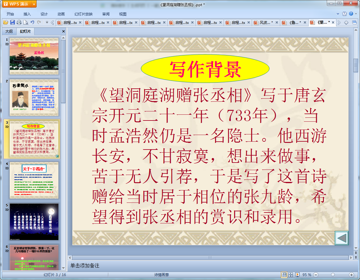 这是有东坡下载站编辑整理的望洞庭湖赠张丞相ppt课件,该课件共有16页内容丰富制作比较精细,对课文中的一些重难点都有介绍,感兴趣的朋友可以来看看我们为大家提供了免费的下载地址!