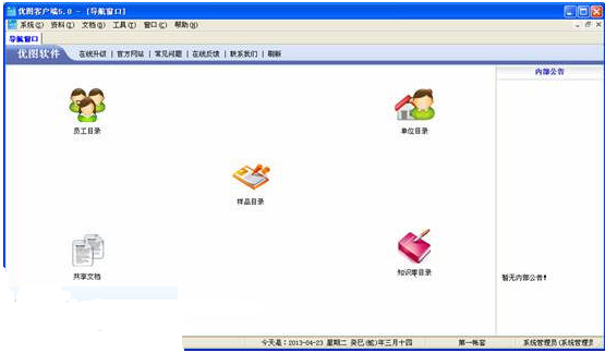 优图样品管理软件是一款通用的样品信息管理软件,主要功能包括样品管理、员工管理 、往来单位管理,同时还包括共享文档管理、知识库管理、内部消息、Excel数据导入导出等功能。