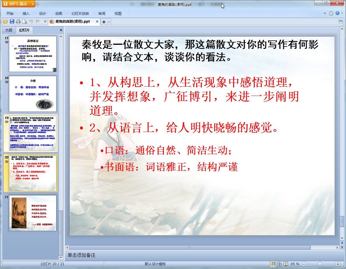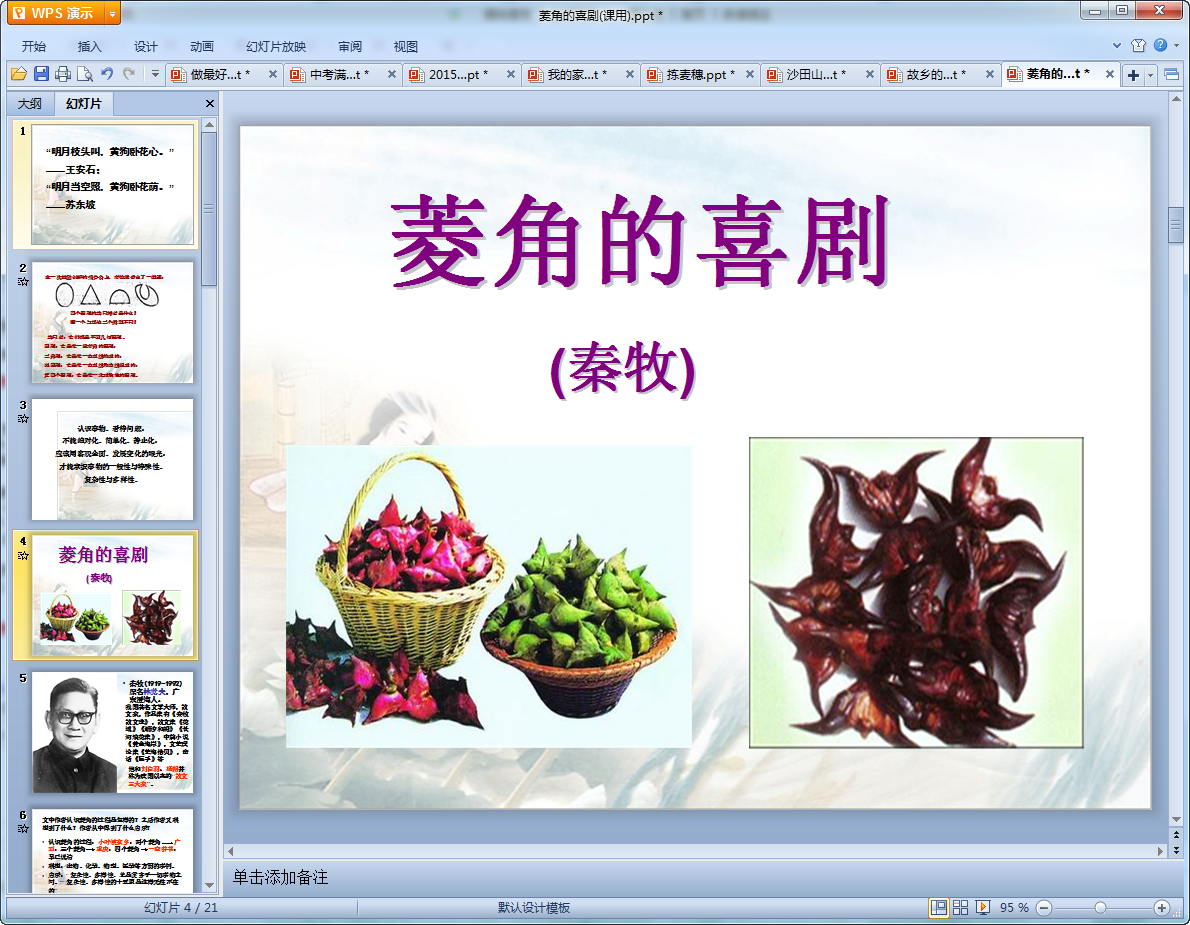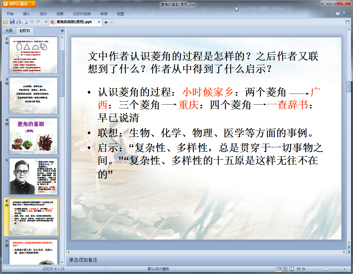 这是一篇高中语文课文菱角的喜剧教学课件,课文中讲述了认识事物、看待问题应该用客观全面、发展变化的眼光,课件共21页内容丰富感兴趣的老师们们可以来看看,我们东坡为大家提供免费得下载服务!