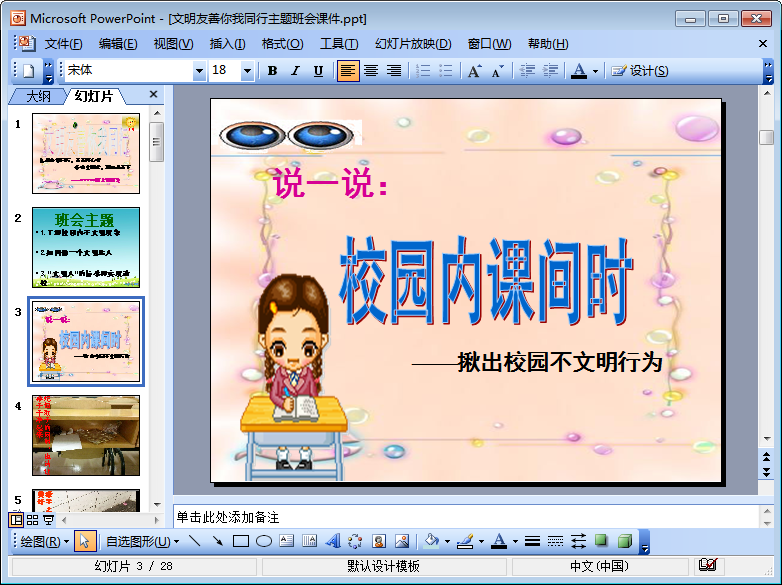 该文明友善你我同行主题班会课件主要围绕了解校园内不文明现象、如何做一个文明达人、“文明人”的标准和实现途径三大方面展开,ppt共由28页组成,需要文明主题班会ppt或是明友善班会课ppt的朋友们可以参考一下!