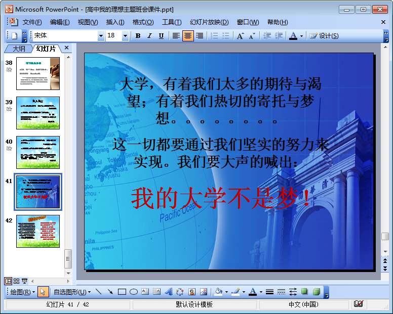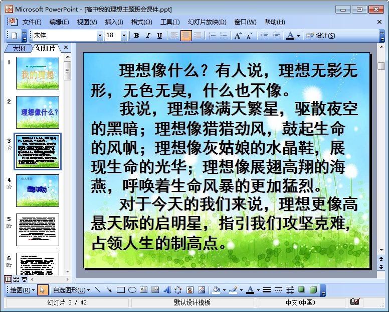 关于理想的主题班会课件本站有很多,本节内容咱们不妨一起来探讨一下你的理想吧!这是一份以“我的理想”为主题展开的班会课件ppt(以下简称为我的理想ppt),该ppt共42页,内容包括“理想是什么”、“理想与成功”两大篇章,希望对大家有所帮助!