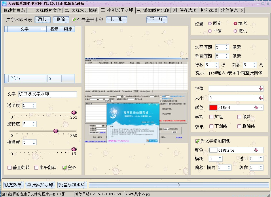 ★文字水印:批量添加文字水印,可设置字体、阴影、位置、透明、旋转、模糊等;