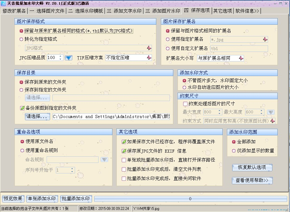 ★批量输出:可选择添加水印后的图片格式、扩展名、命名方式、输出位置等。