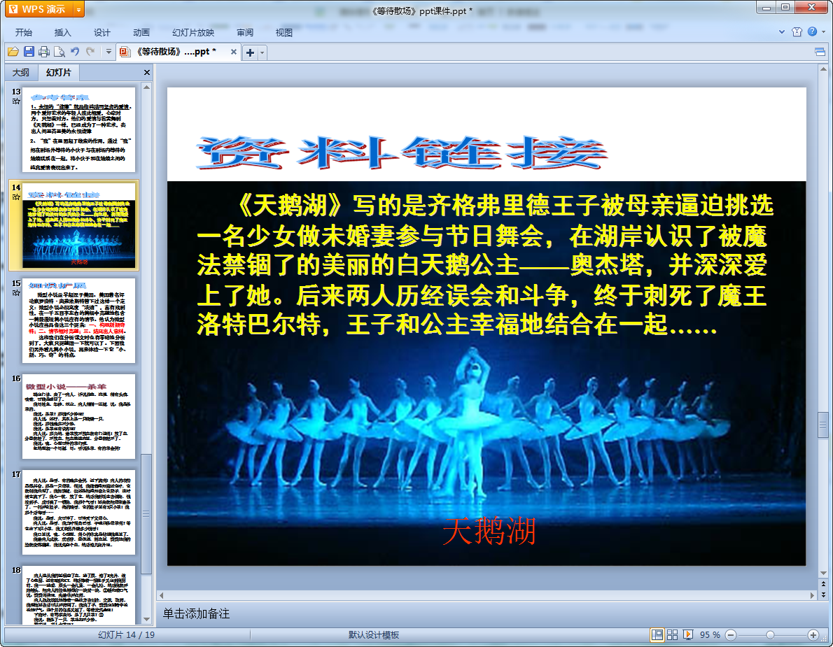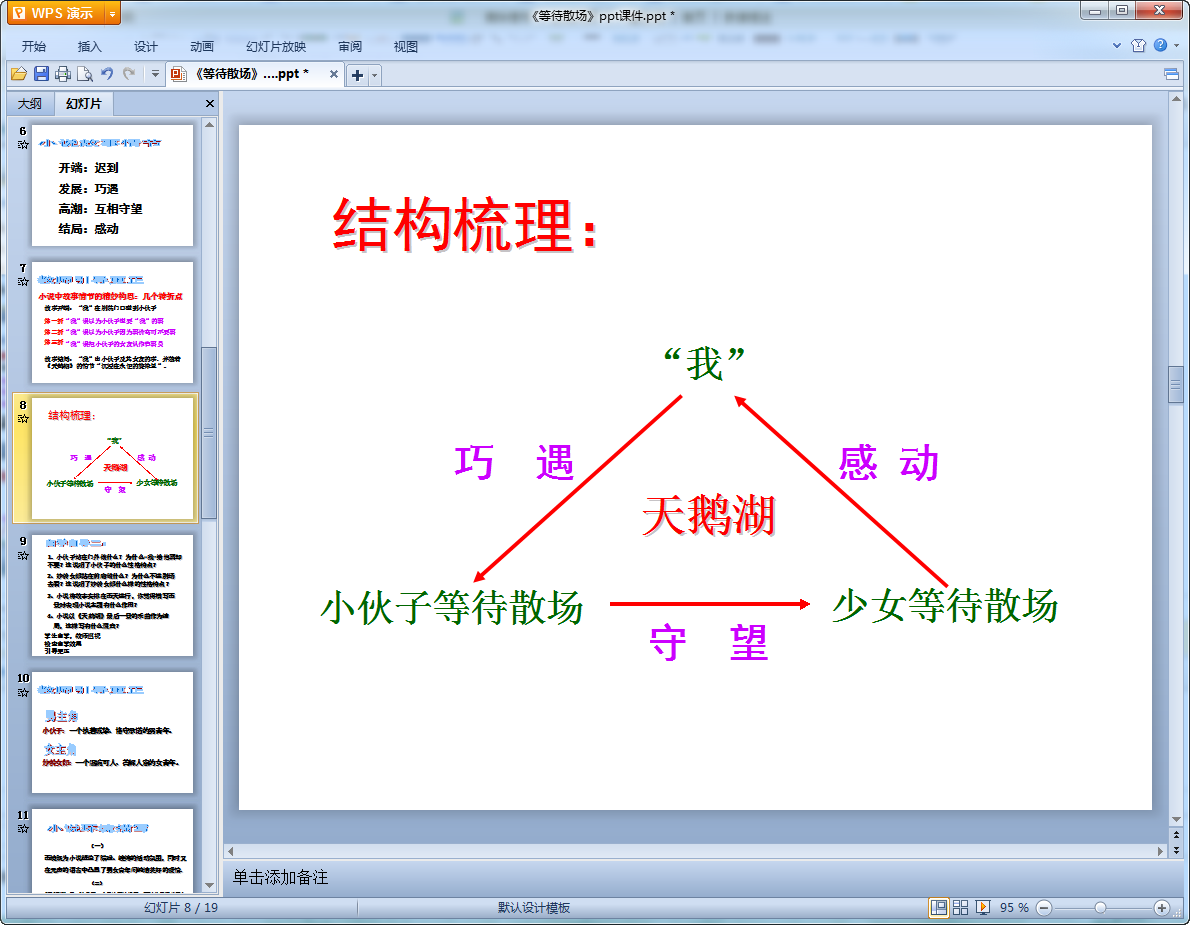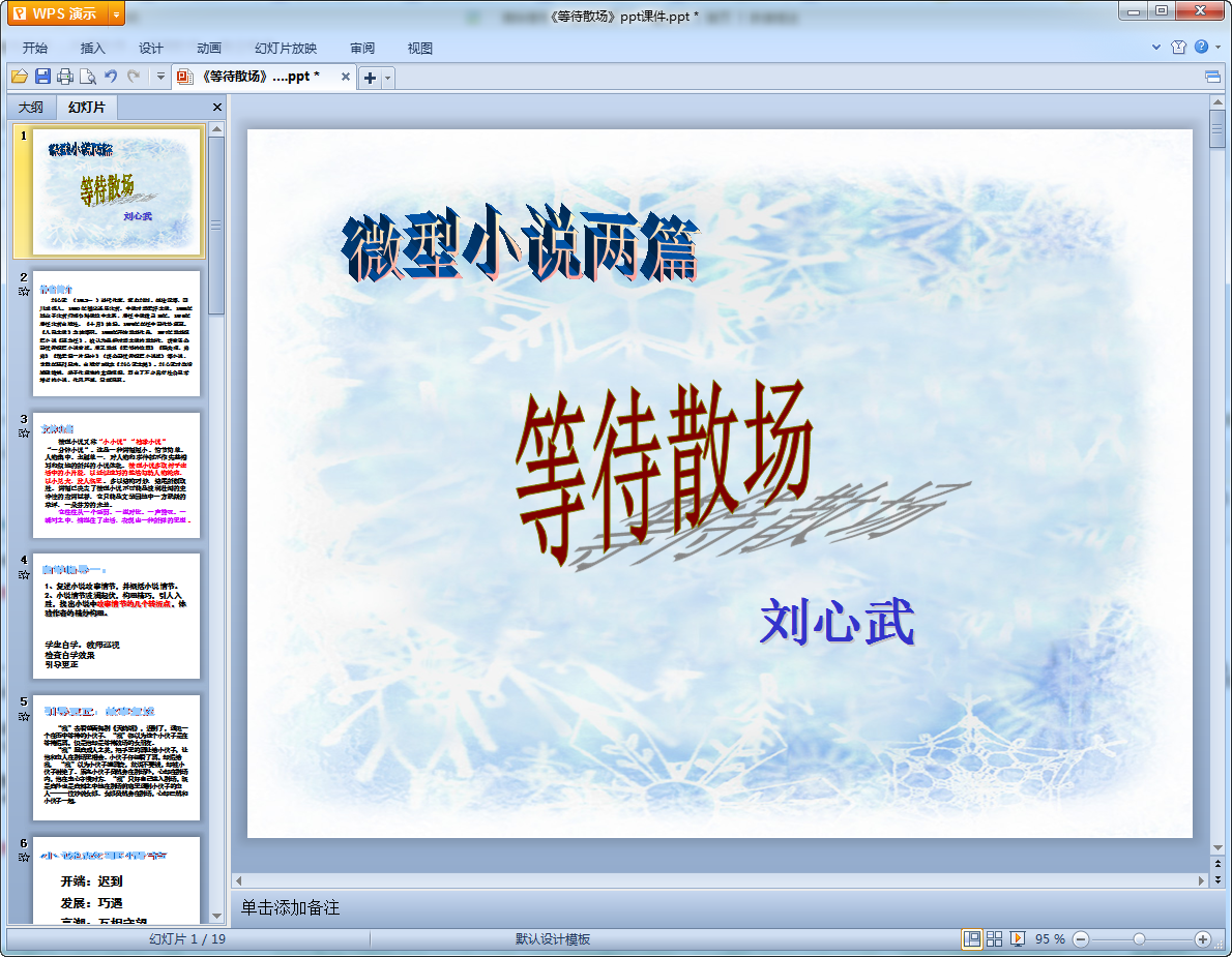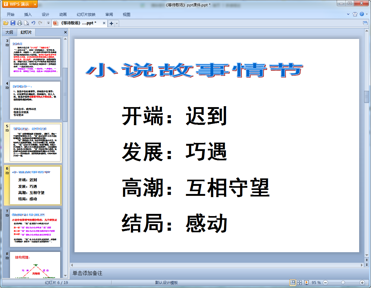 这这是一篇高中语文课文中的等待散场教学课件,课文那种讲述了一个小伙子执著诚挚、恪守承诺的故事。该课件共有19页制作精美,对课文讲解的十分详细,挺不错的教学课件有需要的朋友们可以来免费的下载使用!
