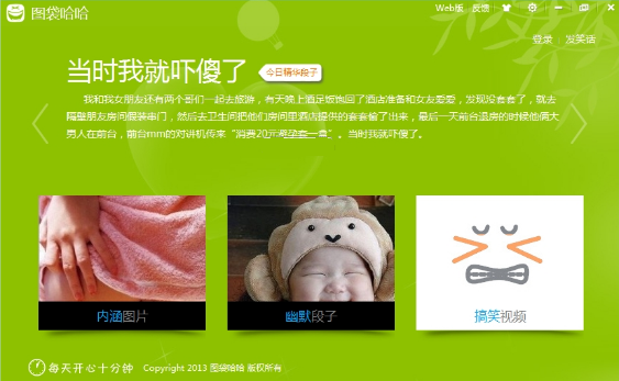 图袋哈哈是一款神奇的减压必备软件,当您在被窝里辗转反侧、公交上烦躁、地铁中无聊、厕所便秘拉稀时,它会自动为您推荐最具人气的爆笑图片、内涵漫画、内涵段子等让你的生活无时无刻都充满正能量,有需要的赶紧来下载使用吧。
