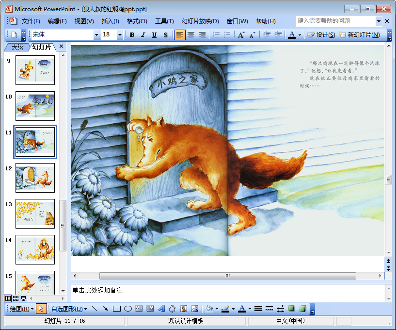 一整天,他都在森林里走来走去,想找一只肥嫩的母鸡。最后,他终于发现了一只鸡。