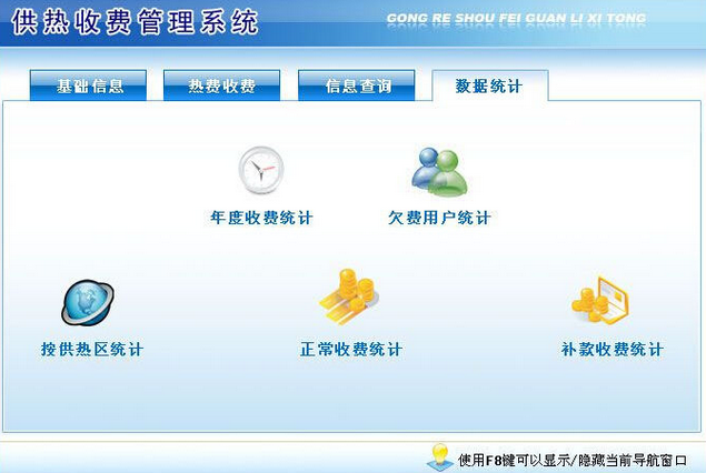数据统计(年度收费统计、欠费用户统计、按供热区统计、正常收费统计、补款收费统计);