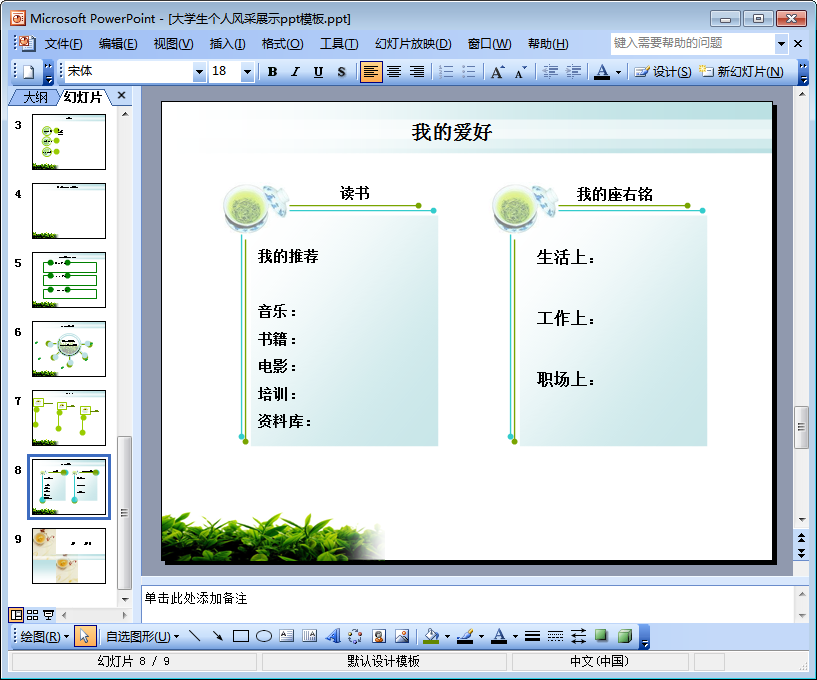 “今天接到一个面试,要我做一个自我风采展示的PPT,脑子里一点主意都没有,请问我该如何下手?”——一个大学生朋友这样问小编,鉴于此,本节内容小编便在此和大家分享一份内容完全免费的、具有清新简约风格的大学生个人风采展示ppt模板以方便更多有需要的朋友们——下载之后你只用按着“指引”填写内容就可以了,没错!有了个人展示ppt模板,个人风采展示ppt简直就是小case了!