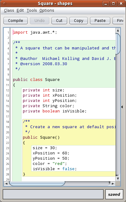 BlueJ的编辑功能独特的范围突出,每个代码块的背景色让你直观地浏览代码更快。它也有助于发现错误的大括号。