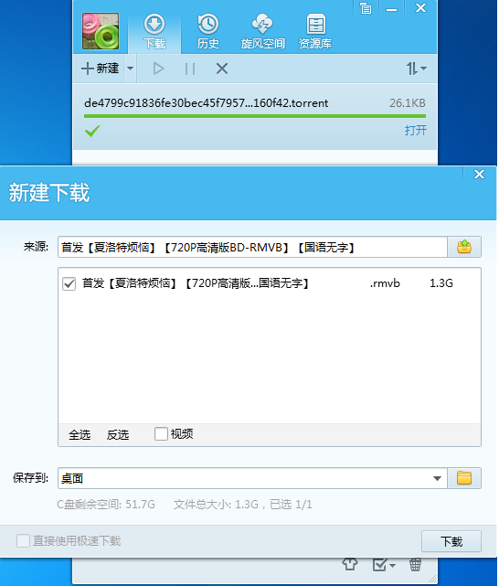 2、种子下载完成后,跳到如下界面,点击下载,即可把资源下载到本地