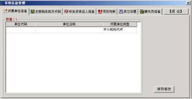 输入“单位代码”与“单位名称”(“开票单位类型”根据您安装的软件类型已经确定),点击“保存修改”按钮保存刚才增加的记录。“开票单位”只能够有一条记录,已经有的记录可以进行修改,修改后点击“保存修改”按钮,数据修改成功。