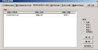 点击“收发货承运人信息”标签,进入“收发货承运人信息”菜单,为了在开票中使用方便,我们可以把经常有业务往来的收、发货承运人的信息首先录入保存到数据库中,在开票过程中,就不需要每次都输入收发货承运人信息,只需进行选择即可。