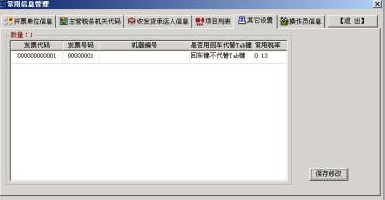 点击“其它设置”标签,进入“其它设置”菜单,“其它设置”中主要设置发票代码,发票的起始号码,机器编号,是否用回车替代Tab键,常用税率等。