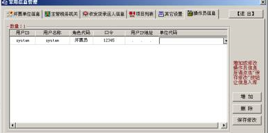 增加操作员,需要多个用户开具发票的场合,需要增加操作员,点击“增加”按钮可以增加一条记录,输入用户ID、用户名称、选择角色代码(为开票员)、用户口令、选择单位代码(用户所在单位),输入完毕后,点击“保存修改”按钮保存刚才增加的记录。