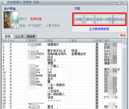下载打开软件后点击群发即可发给多个微信群,可以设置机器人自动回复