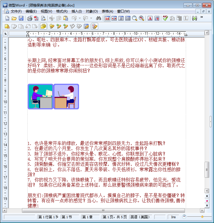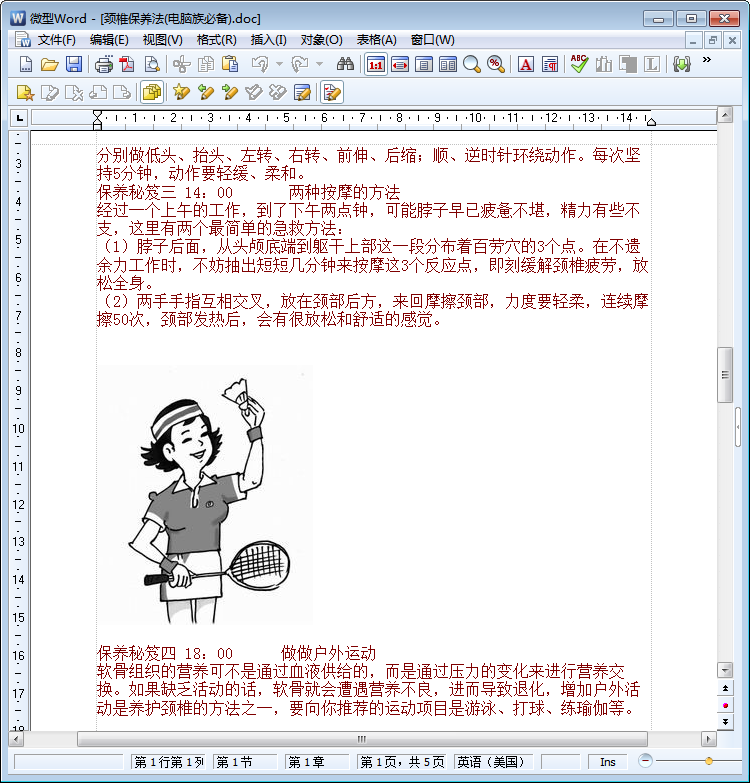 没有颈椎病的人是不知道有颈椎病是什么感觉的,患有颈椎病的朋友表示这是一种非常让人懊恼的病——脖子非常僵硬,还恶心晕晕的,睡觉都睡不好……既然如此糟糕,那么有没有什么方法能预防这种疾病的发生呢?本节内容小编和大家分享的是一份word免费版图文教程颈椎保养法,小编真心建议电脑族们速度收藏——为了你的健康着想,为了你的颈椎着想!