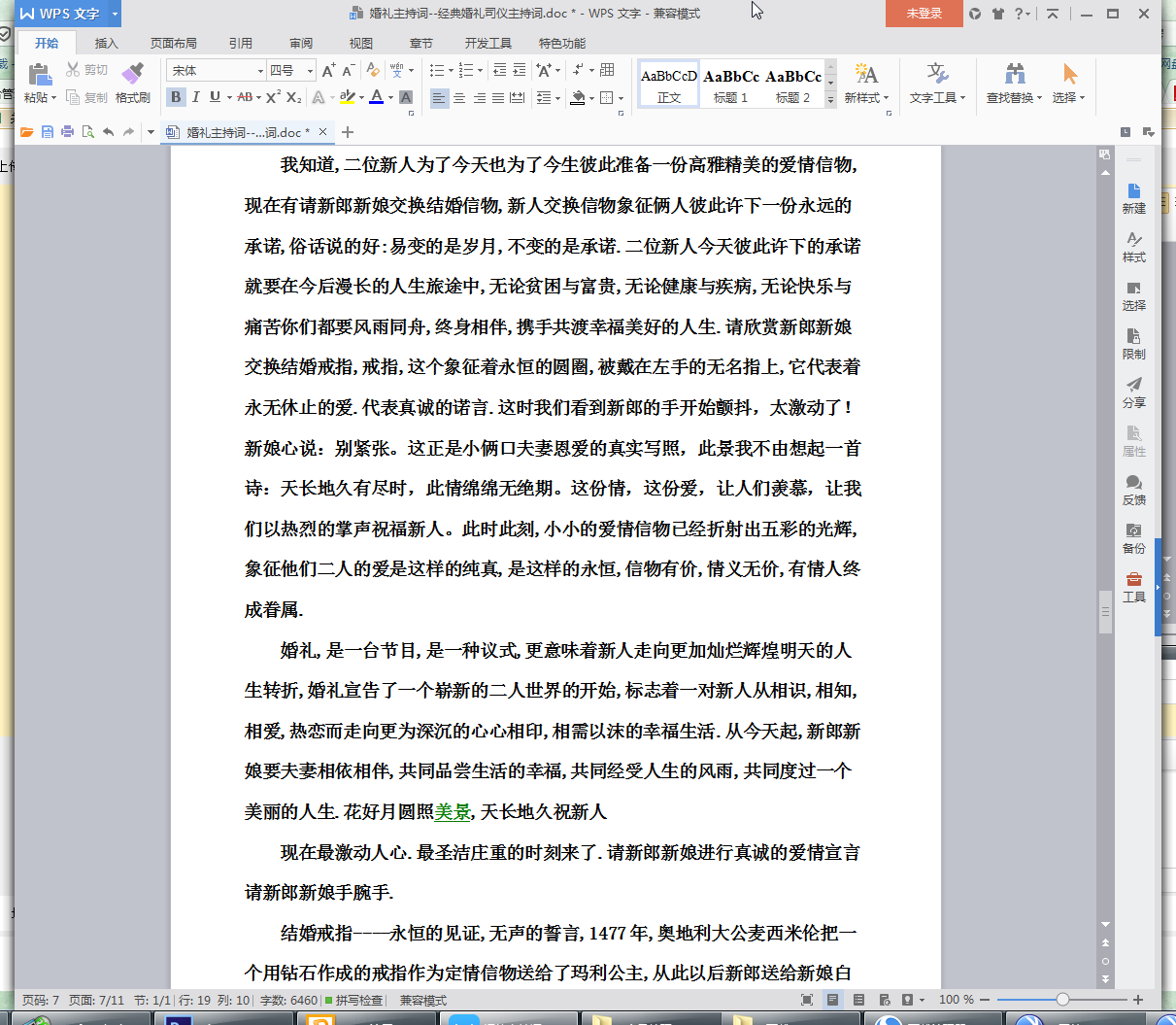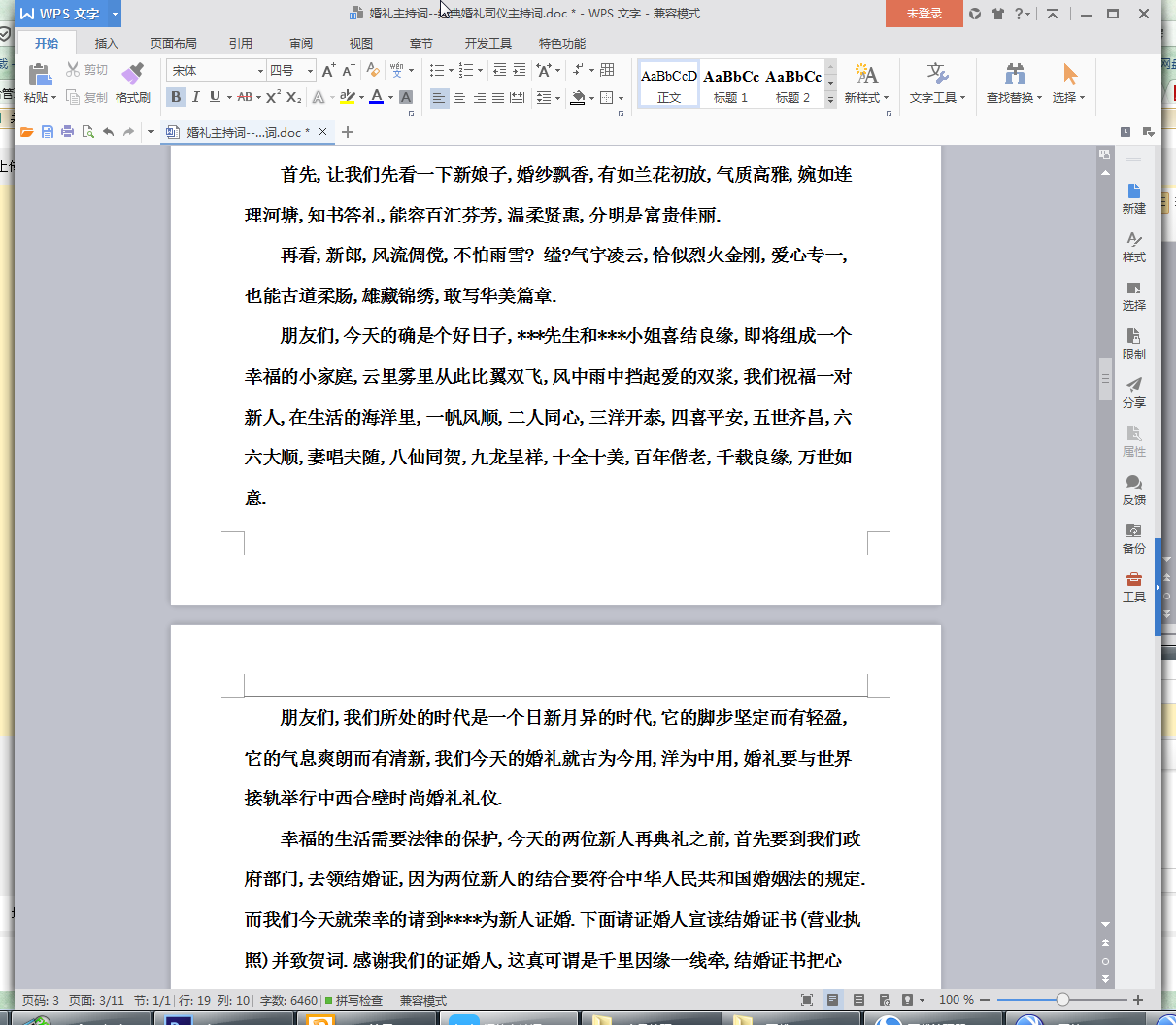 来宾们今天是公元****年**月**日(农历六月初八)是良辰吉日,在这大吉大利吉祥喜庆的日子里,我们怀着十二分的真诚的祝福相聚在***酒楼一楼婚宴大厅共同庆贺***先生与***小姐新婚典礼.(首先我们给予掌声的恭喜)大家都知道结婚是人生中的一件大事,而婚礼更是人生中最幸福神圣的时刻,尤其婚礼上浪漫温馨高雅别致的婚礼仪式以及亲朋好友的良好祝愿会给新人一生永远带来最美好的回忆.各位亲朋好友,我是本次婚礼庆典的主持人***.今天我十分荣幸地接受新郎新娘的重托,步入这神圣而庄重的婚礼殿堂为新郎***,新娘***的婚礼担任司仪之职.让我们在这里共同见证一对新人人生中最幸福神圣美好的一刻!