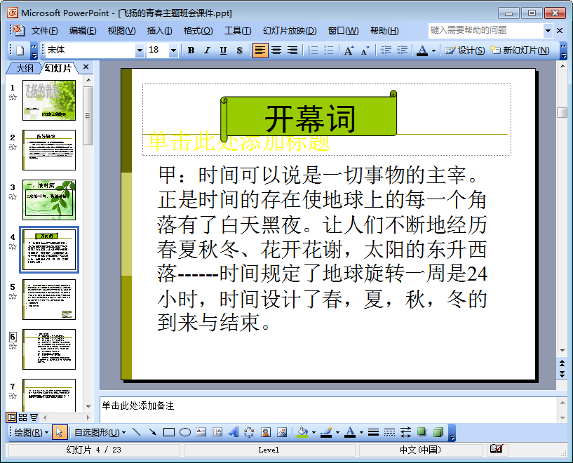 我们同学正值人生的花季。青春的血液在奔流,青春的心儿在跃动,青春的脚步在延伸。驻足青春的驿站,我们回味昨天,畅想明天,青春的岁月如火如花!青春让我们充满热情,充满朝气,充满希望!来吧!让我们诵诗、唱歌、舞蹈,自由奔放地歌颂青春吧。飞扬的青春,飞扬的神采。青春就在那里,闪着光,向我们微笑。抓住她,跟随她的光芒,那么等待我们的将是奇迹。我们的足迹将化作一个个音符,我们要谱写壮丽的青春之歌。请跟我来,让我们一起踏上青春的快车,欣赏那一道道亮丽的风景线!