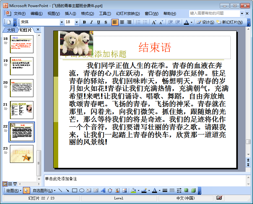 这是一份青春洋溢、充满活力的ppt,该ppt内容积极向上,共由23页组成,既适合作为主题班会课件有适合作为青年节活动ppt。下文是该飞扬的青春主题班会课件(青年节ppt)的内容摘选及预览图,希望这样一份充满正能量的ppt能对大家有所帮助和启发!