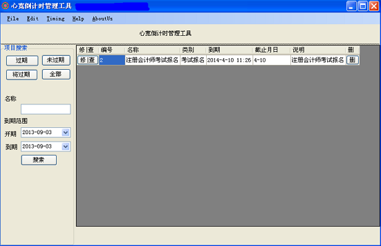 心宽倒计时管理工具主要用于对有截止期限的日期任务进行管理,对关注的任务进行时间提醒。如生日,到期服务,考试报名日期等。同时也包含定时自动关机功能,日期计算功能,最新到期任务桌面悬浮提示功能,有需要的赶紧来下载使用吧。