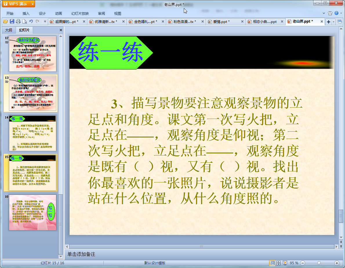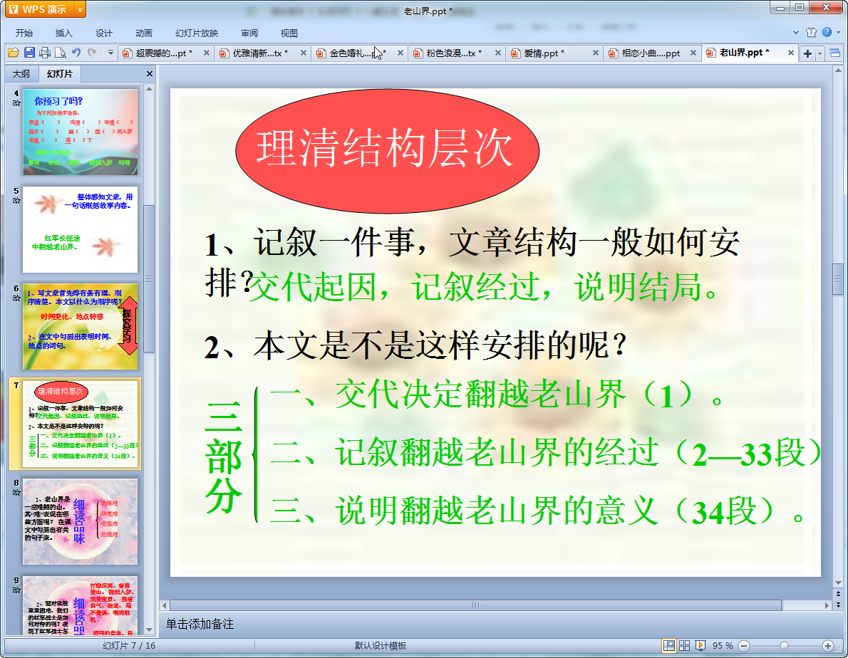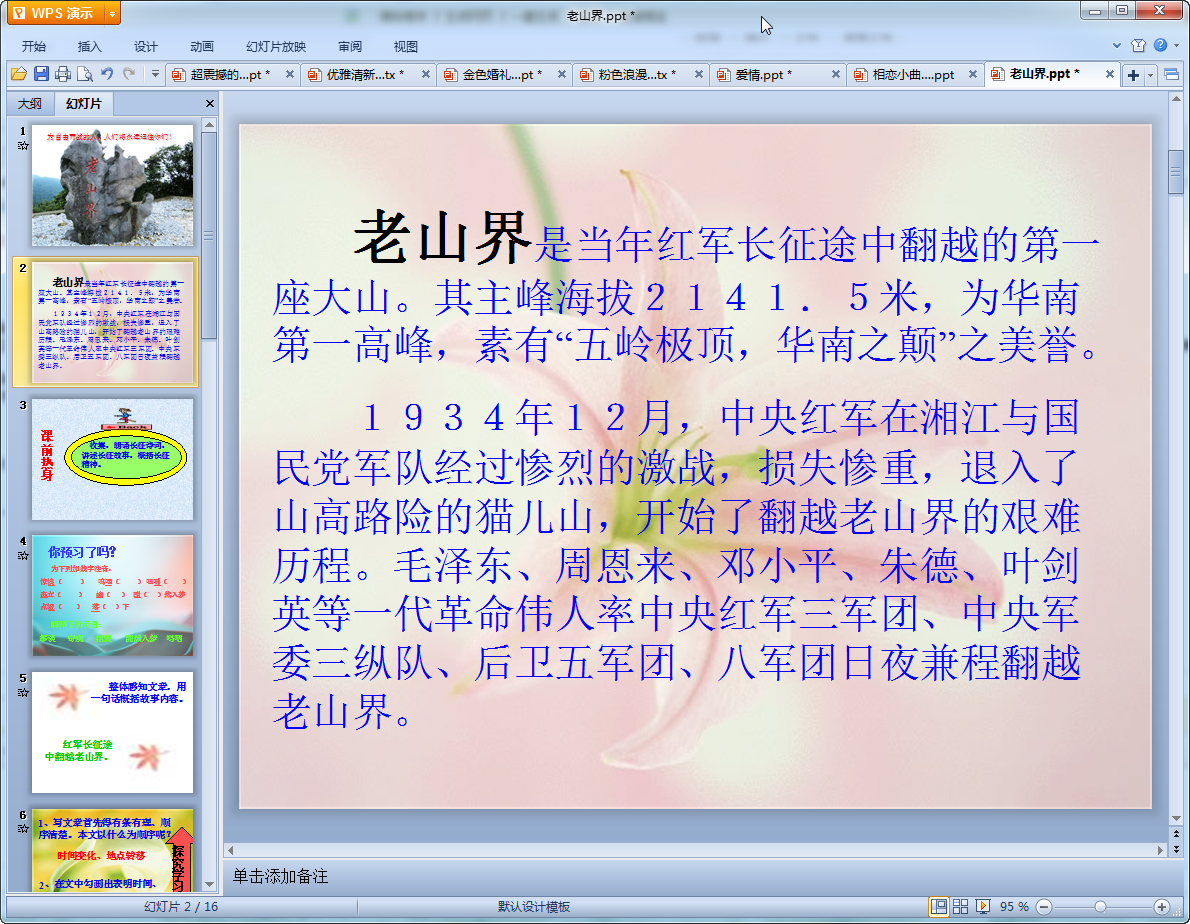 这是有东坡下载编辑整理的初中语文老山界教学课件,该课件共有16页被人丰富制作精细对课文的讲解十分清楚,非常不错的教学课件有需要的老师同学们可以来这边看看,我们为大家提供免费的下载地址!