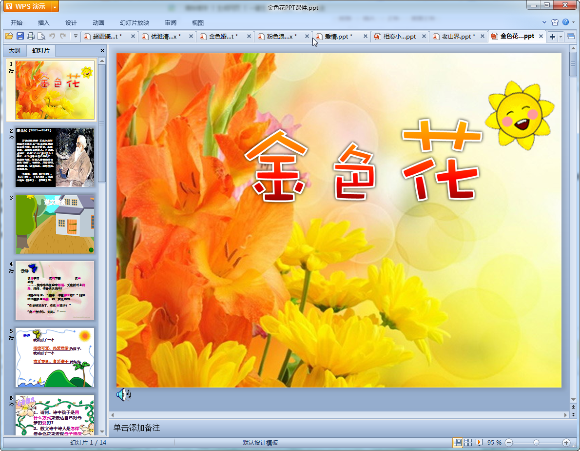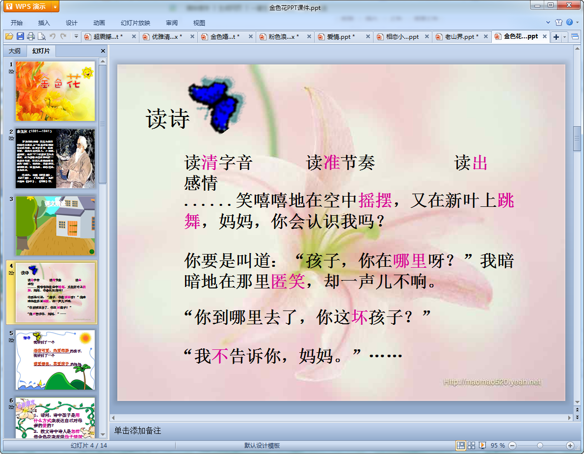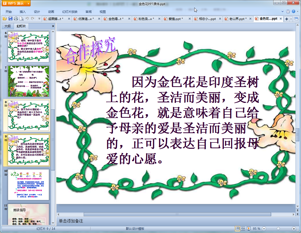 这里是我们小编收集整理的泰戈尔的金色花教学课件,该课件制作精美共有15页对课本中的重难点讲解的十分清楚,非常适合同学们预习,有兴趣的同学老师们可以来看看,我们东坡为大家提供免费的下载服务!