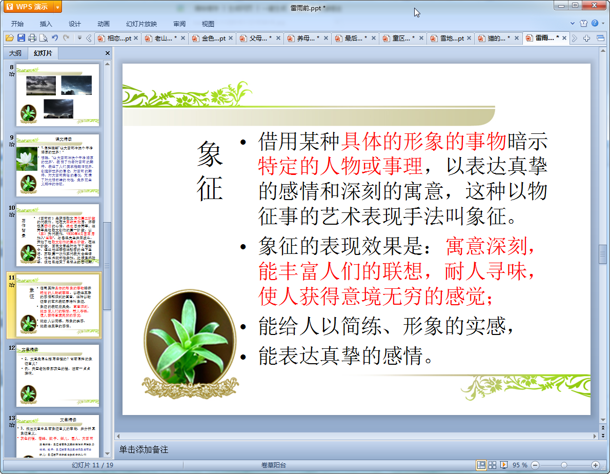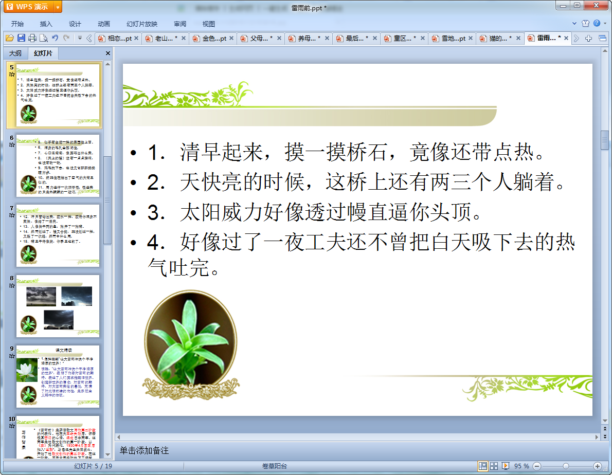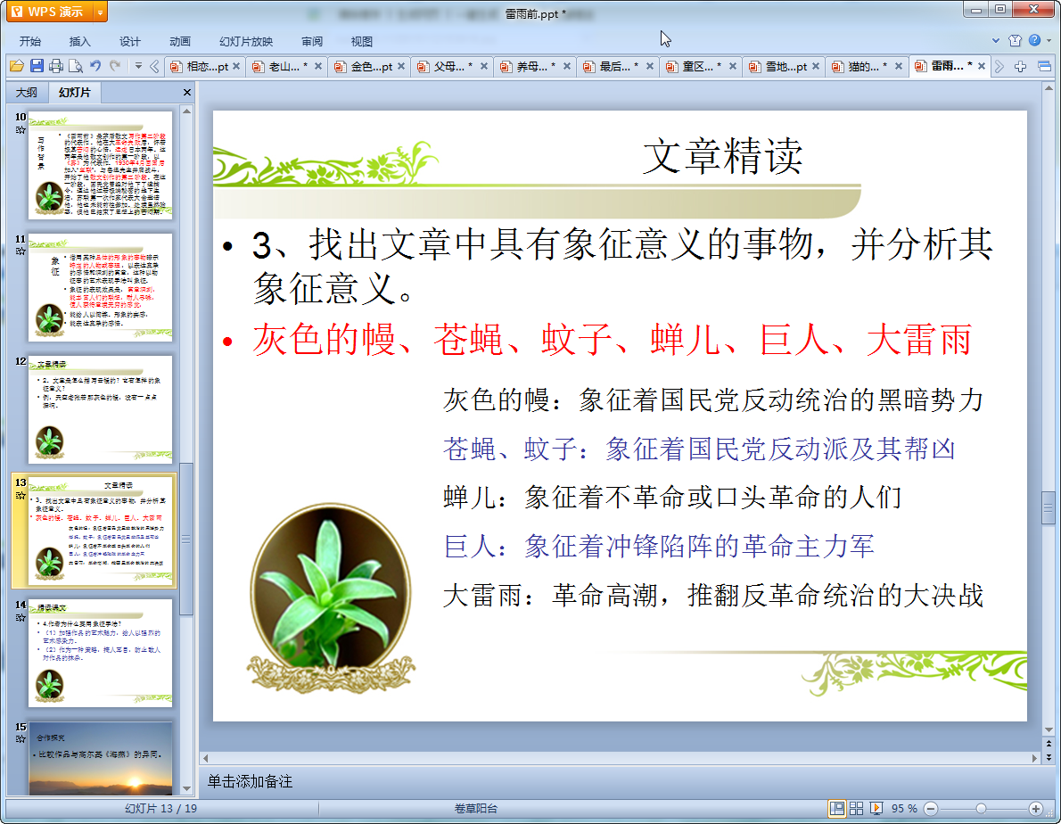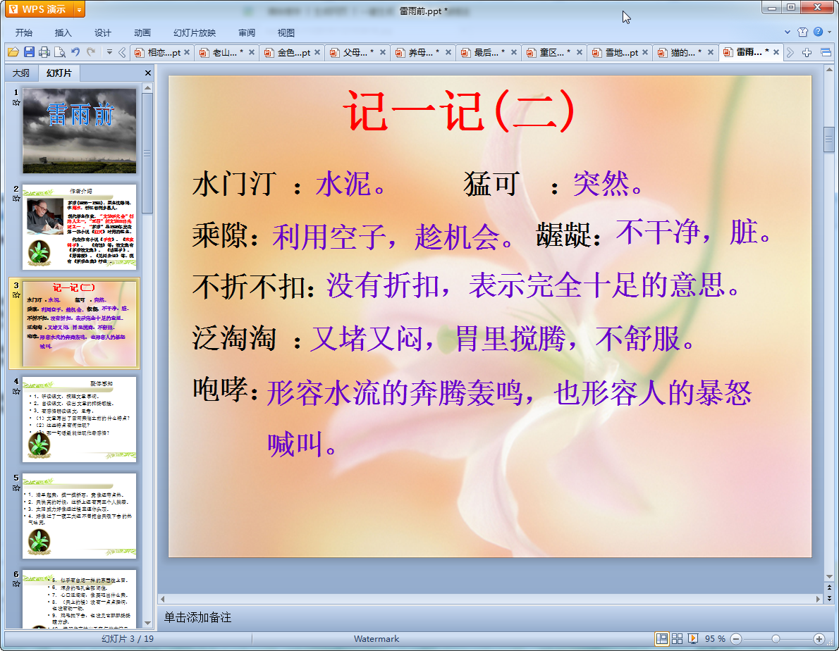 这是茅盾的一篇作品雷雨前教学课件,取自初中语文,该课件共有19页内容比较丰富对文章中的各个知识点讲解的都十分清楚,喜欢使用ppt教学的老师们可以来看看,我们为大家提供了免费的下载!