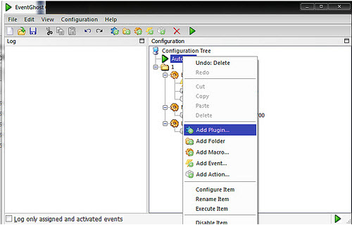 启动EventGhost后, 通过菜单File->New, 开始新的设置. 它的窗口布局分为如下所示的左右两边: 左边的是日志窗口, 所有的窗口事件都显示这里面, 每个事件为单独的一行, 注意每一行都是可以拖动的 (我们会在后面用到), 右面是具体的事件/触发配置的窗口.