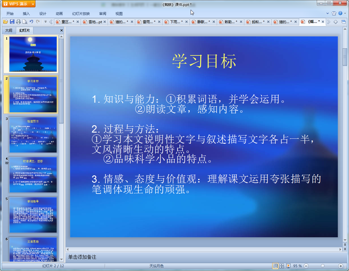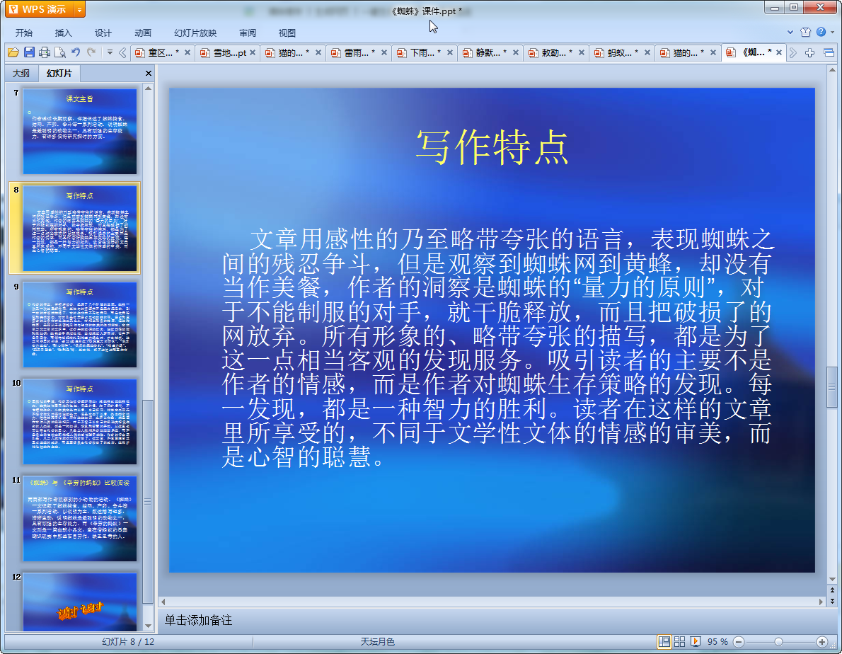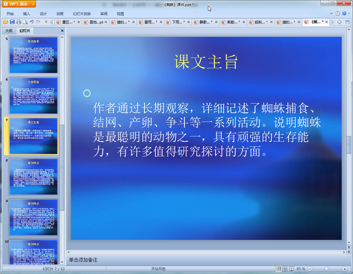这里东坡小编给大家带来的是一篇初中语文中蜘蛛教学课件,该课件共有12页内容丰富对课文中的知识点讲解十分清楚,内容制作简洁不花哨,深受老师们的喜欢,钟爱ppt教学的老师们一定不要错过这篇教学课件!
