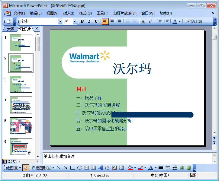 这份由33页组成的ppt主要从沃尔玛的概况、沃尔玛的发展进程、沃尔玛的经营战略分析以及沃尔玛的国际化战略分析和给中国零售企业的启示五大方面对沃尔玛企业进行了介绍,希望这样一份沃尔玛ppt能对大家有所帮助和启发!