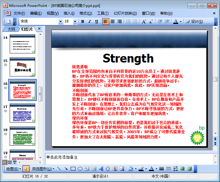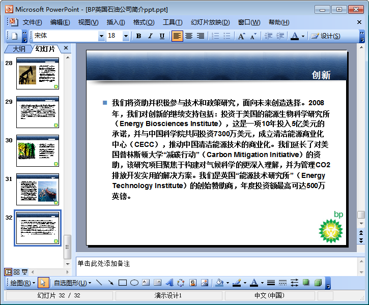 打开财富世界500强排行榜,你会发现BP英国石油公司赫然在目,不知道你对这家世界500强企业了解多少呢?如果你表示“知之甚少”,那么不妨就随小编一起来看看这份免费完整版、共由32页组成的BP英国石油公司简介ppt吧!值得一提的是该ppt若是作为介绍性ppt模板进行使用也是非常不错的哦!