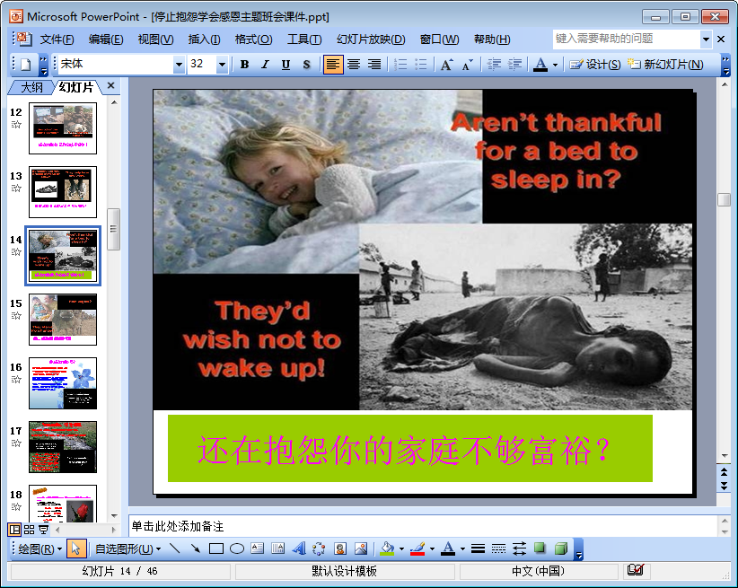 你在抱怨食堂的饭菜难吃吗?你在抱怨可供自己玩的游戏不够多吗?或者你正在抱怨自己的衣着不够时髦?如果你正在抱怨的话,那么就赶紧停止抱怨吧!——为什么这么说呢?相信在这份学会感恩主题班会ppt之停止抱怨学会感恩主题班会课件你会找到答案的!