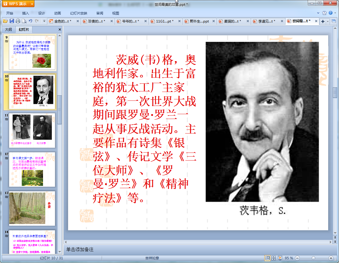 茨威(韦)格,奥地利作家。出生于富裕的犹太工厂主家庭,第一次世界大战期间跟罗曼·罗兰一起从事反战活动。主要作品有诗集《银弦》、传记文学《三位大师》、《罗曼·罗兰》和《精神疗法》等。
