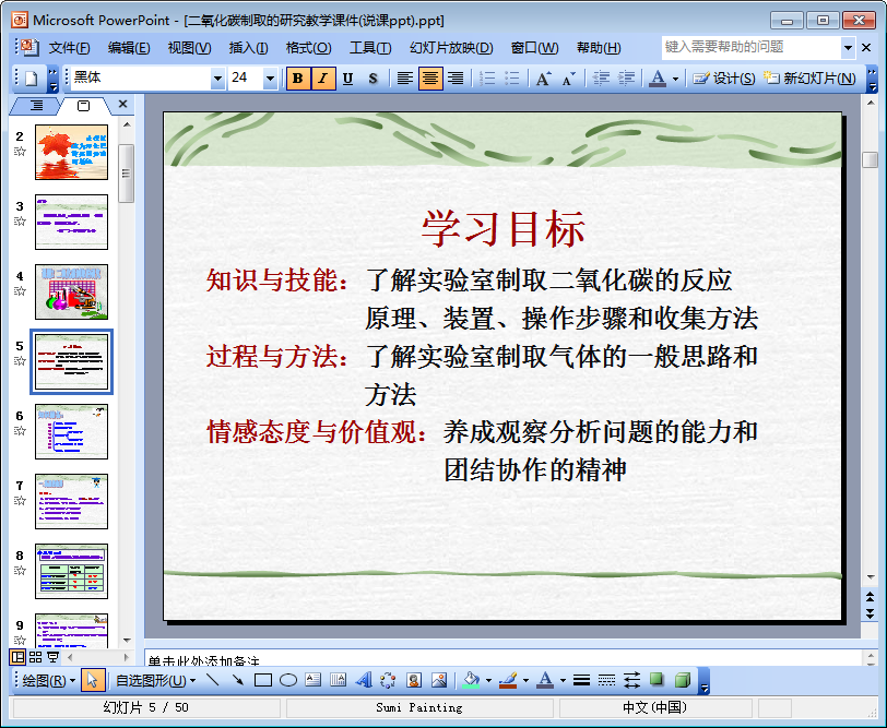 有朋友给小编留言表示需要一份关于二氧化碳制取的研究说课课件,于是小编便整理出了这样一份十分精致的二氧化碳制取的研究教学课件,该课件共由30页,内容完全免费,下文是该ppt的内容摘选及预览图,需要查阅该二氧化碳制取的研究ppt课件全部内容的朋友之前轻轻点击本文相应的下载地址进行下载即可!