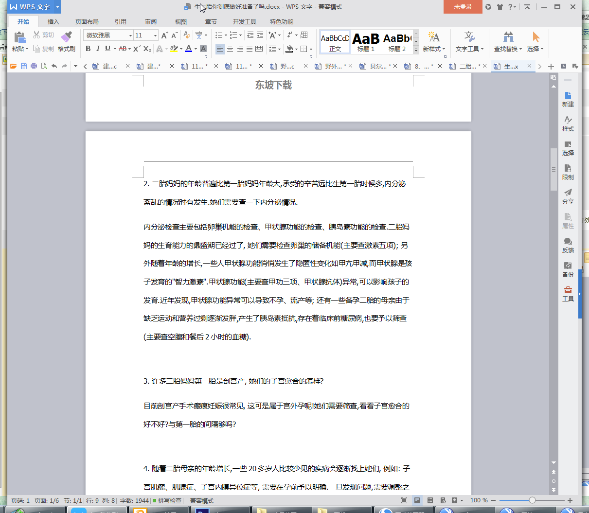 最近二胎的话题火热,但是作为准备生二胎的妈妈们真的都准备好了吗?这里我们东坡下载给广大的女性朋友们带来了这篇生二胎你到底做好准备了吗word,对生二胎前所需要的准备注意事项都有一些介绍,有兴趣的可以来这边看看,我们为大家提供免费的下载!