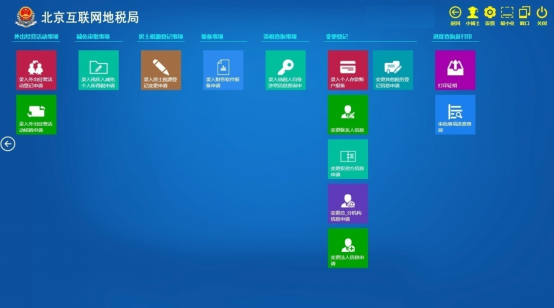在北京互联网地税局主页点击“涉税事项办理”磁贴(即小方块),进入涉税事项办理功能界面,如下图: