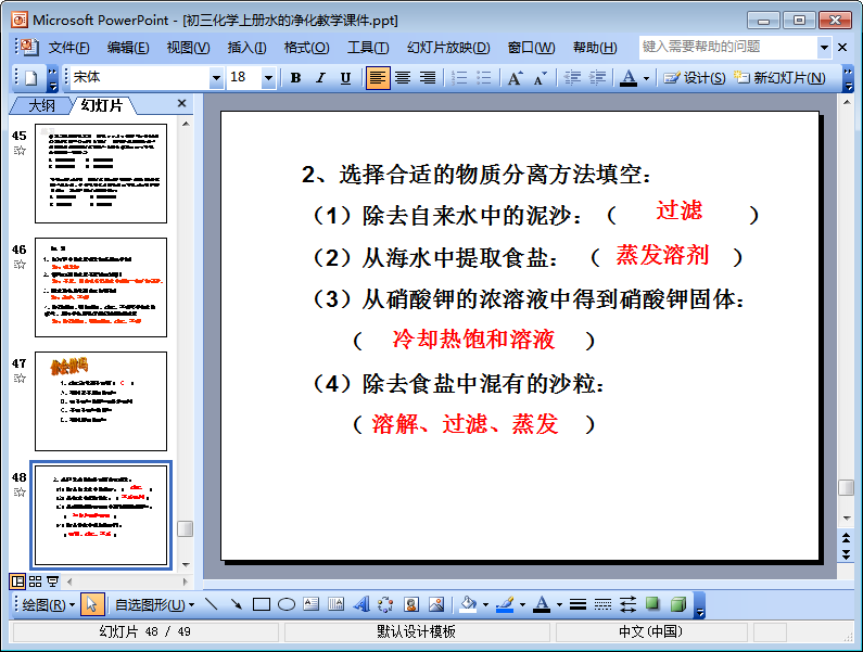 初三化学上册水的净化这一课题旨在让学生了解吸附、沉淀、过滤和蒸馏等净化水的方法以及纯水与软水、自然水、硬水的区别,另外这一课题还要求学生会做沉淀、过滤实验,培养实验能力等,本节内容小编为大家整理带来的这份水的净化ppt课件就是以以上教学点为出发点而设计的,下面就赶紧来看看这份九年级化学ppt课件吧!