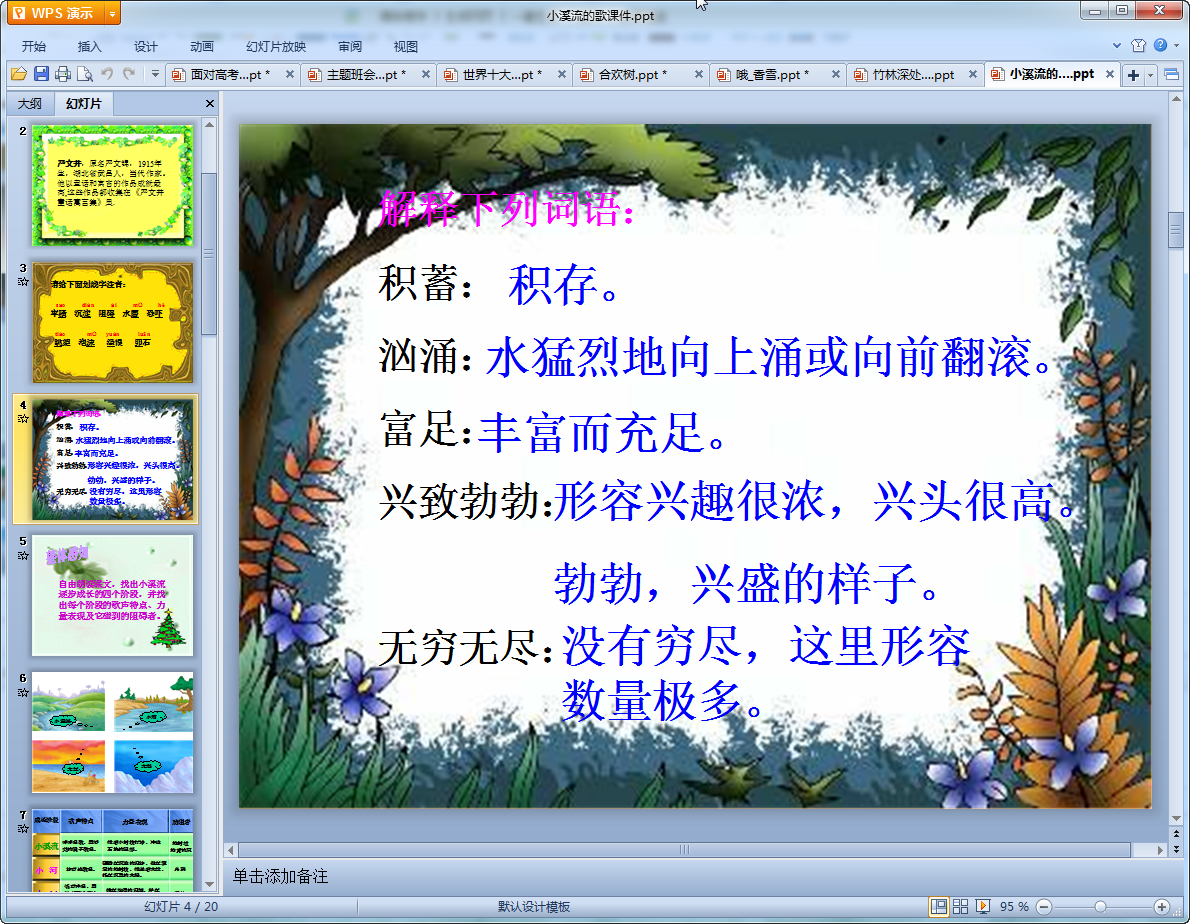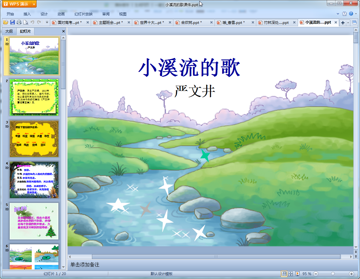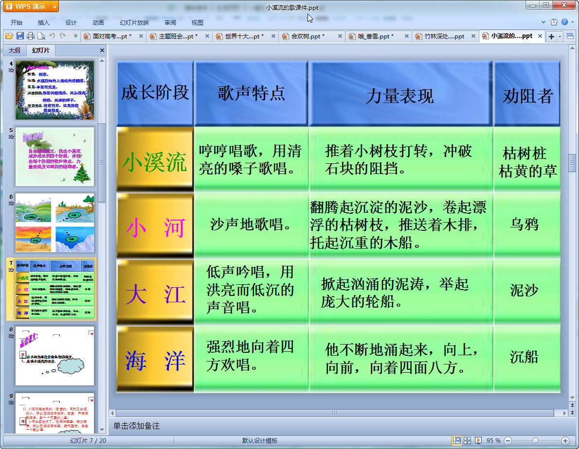 这是一篇初中语文小溪流的歌教学课件,课文中表达出了坚持前进永不放弃的精神。课件共有20页内容丰富对课文中知识点讲解清楚,有需要的老师们可以来我们东坡免费的下载使用!