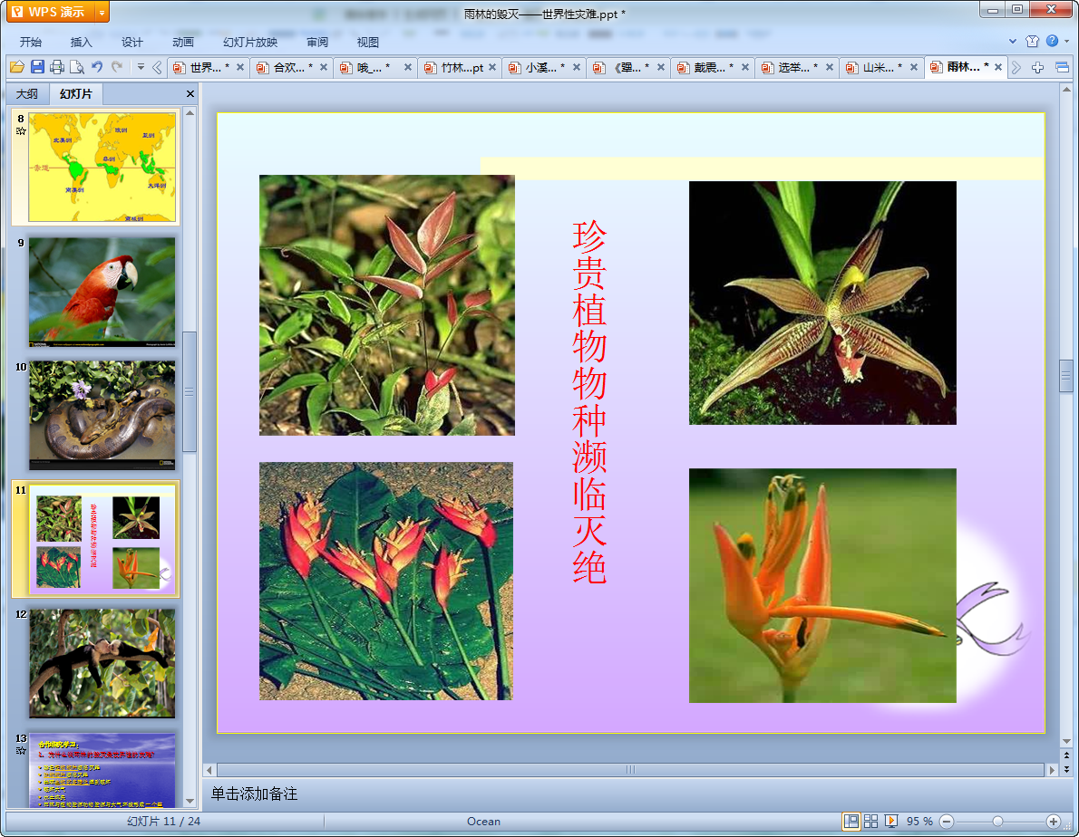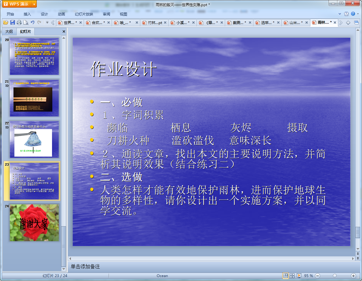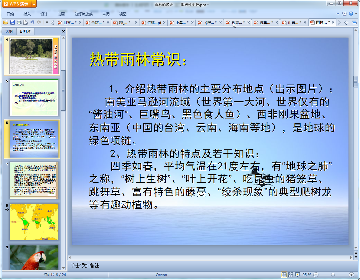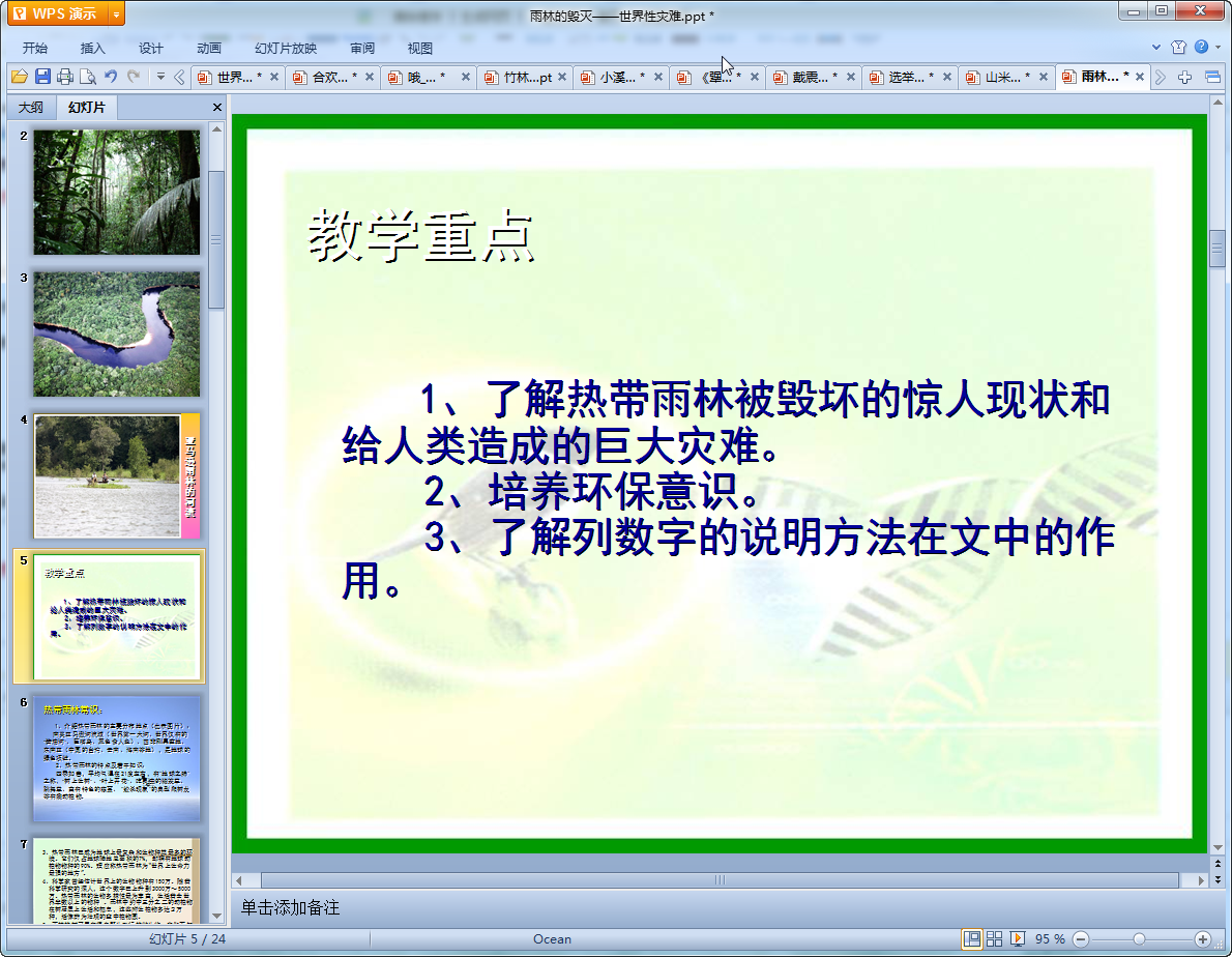 这是一篇语文课文中的雨林的毁灭世界性灾难教学课件,课件共有24页对课文中的知识点讲解比较清楚,添加大量的图片来警示人们需要保护我们自己的地球,非常有教育意义的一篇教学课件,有需要的朋友们可以来这边免费的下载使用!