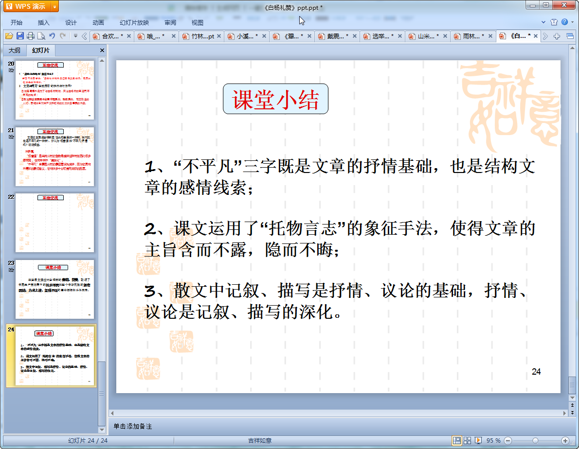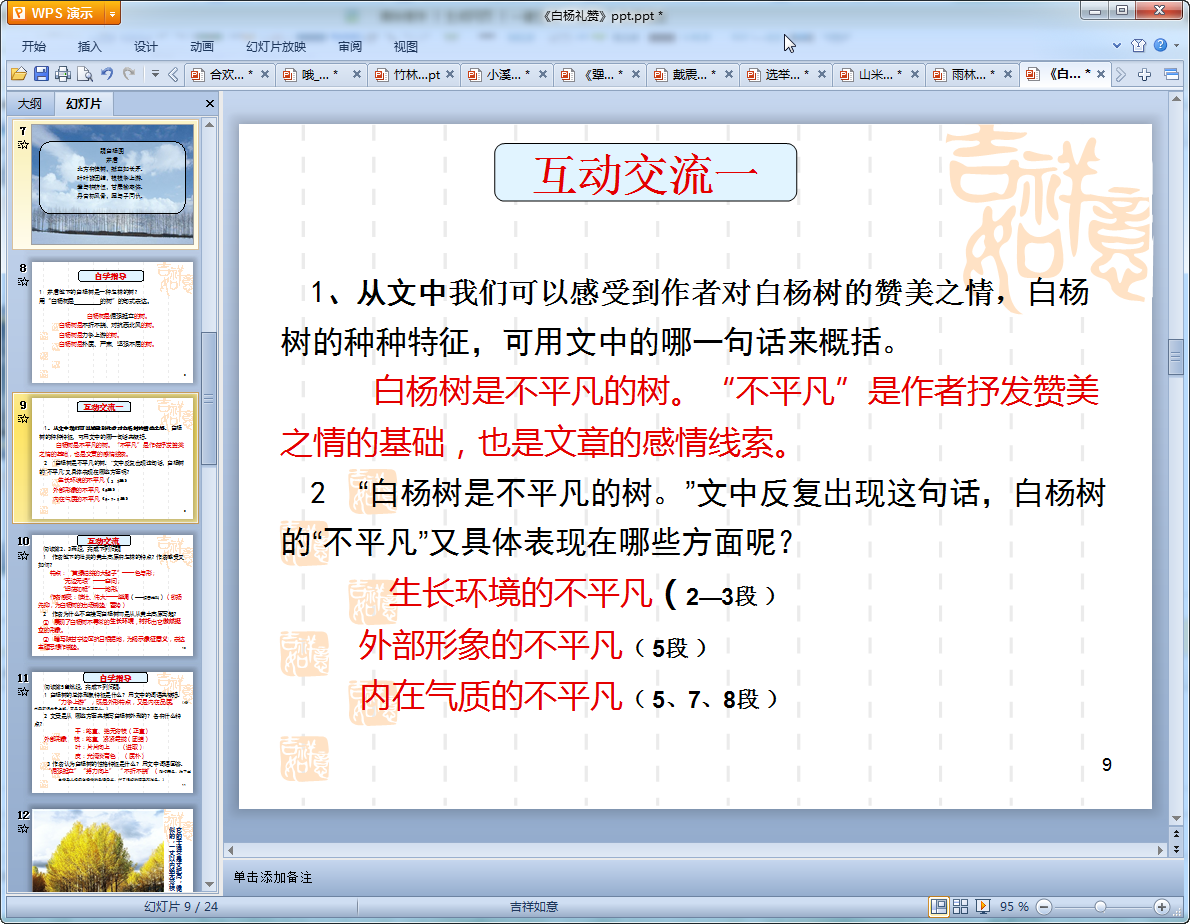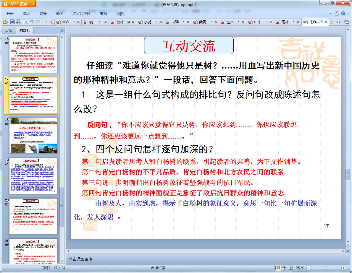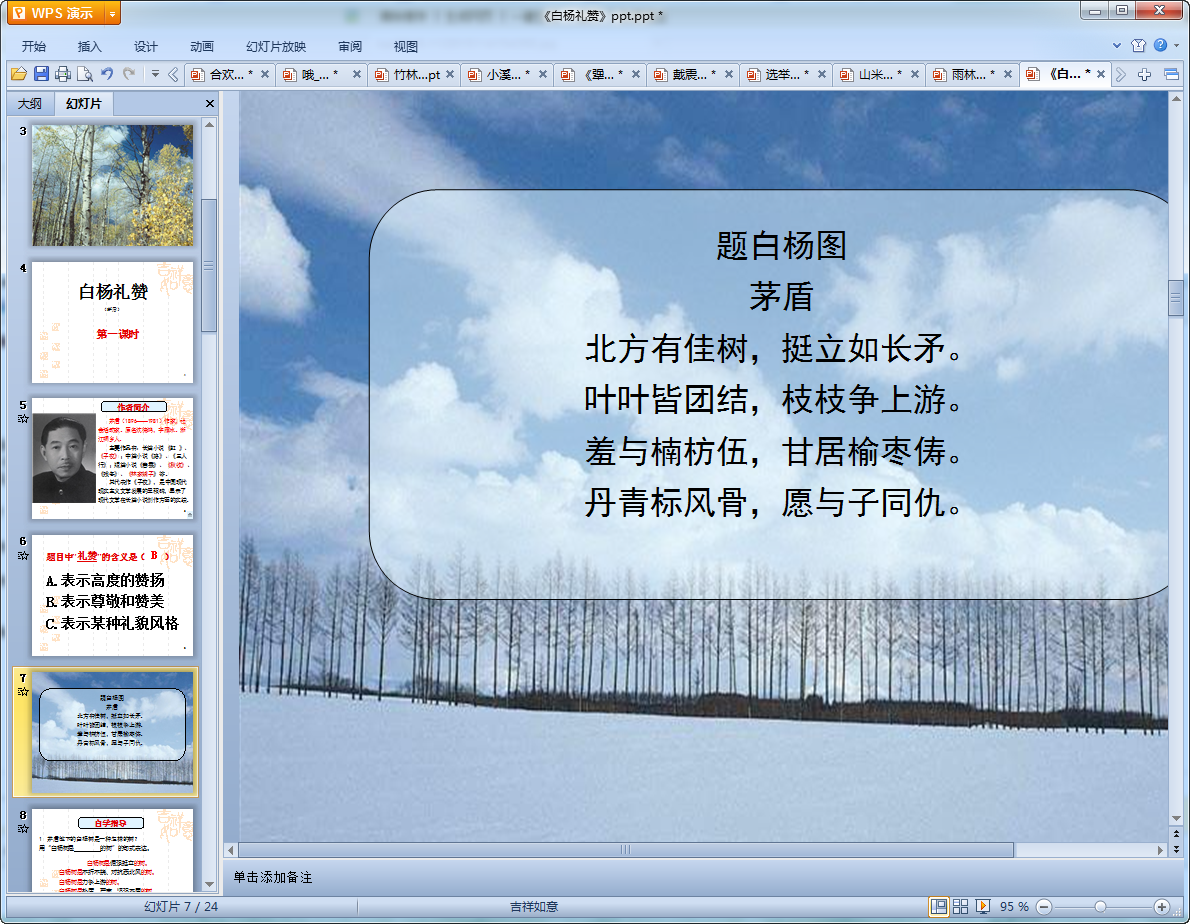 这是由我们东坡下载编辑整理的白杨礼赞教学课件,该课件共有24页制作精美,内容丰富对课文中的知识点讲解的十分清楚深受老师们的喜欢,有需要的朋友们可以来这么免费的下载使用!