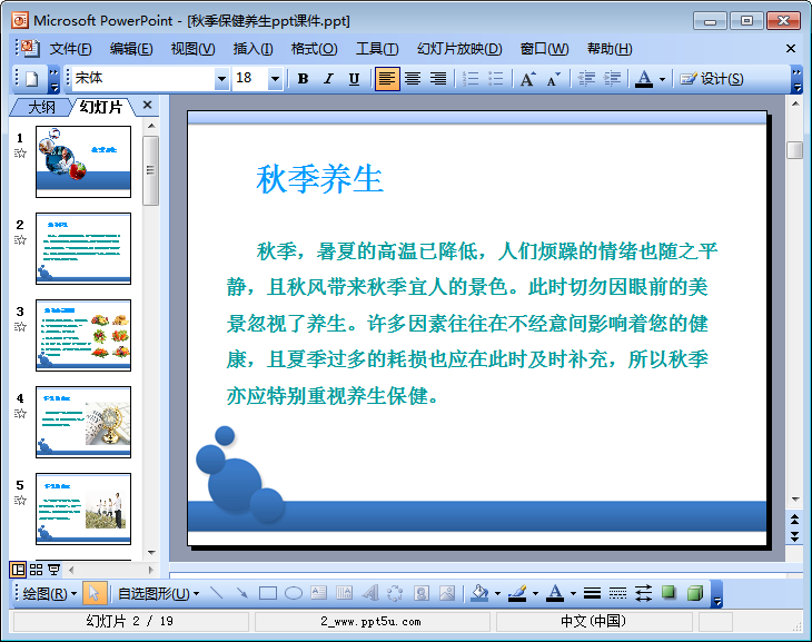 如果要在秋季进行保健养生的话应该注意哪些事情呢?在饮食上又有哪些事是应该注意的呢?本节内容小编为大家整理带来的这份秋季保健养生ppt课件就对这些问题进行了详细的说明,下文是该ppt的相关内容介绍,想要查阅该ppt全部内容的朋友只需轻轻点击本文相应的下载地址进行下载即可!