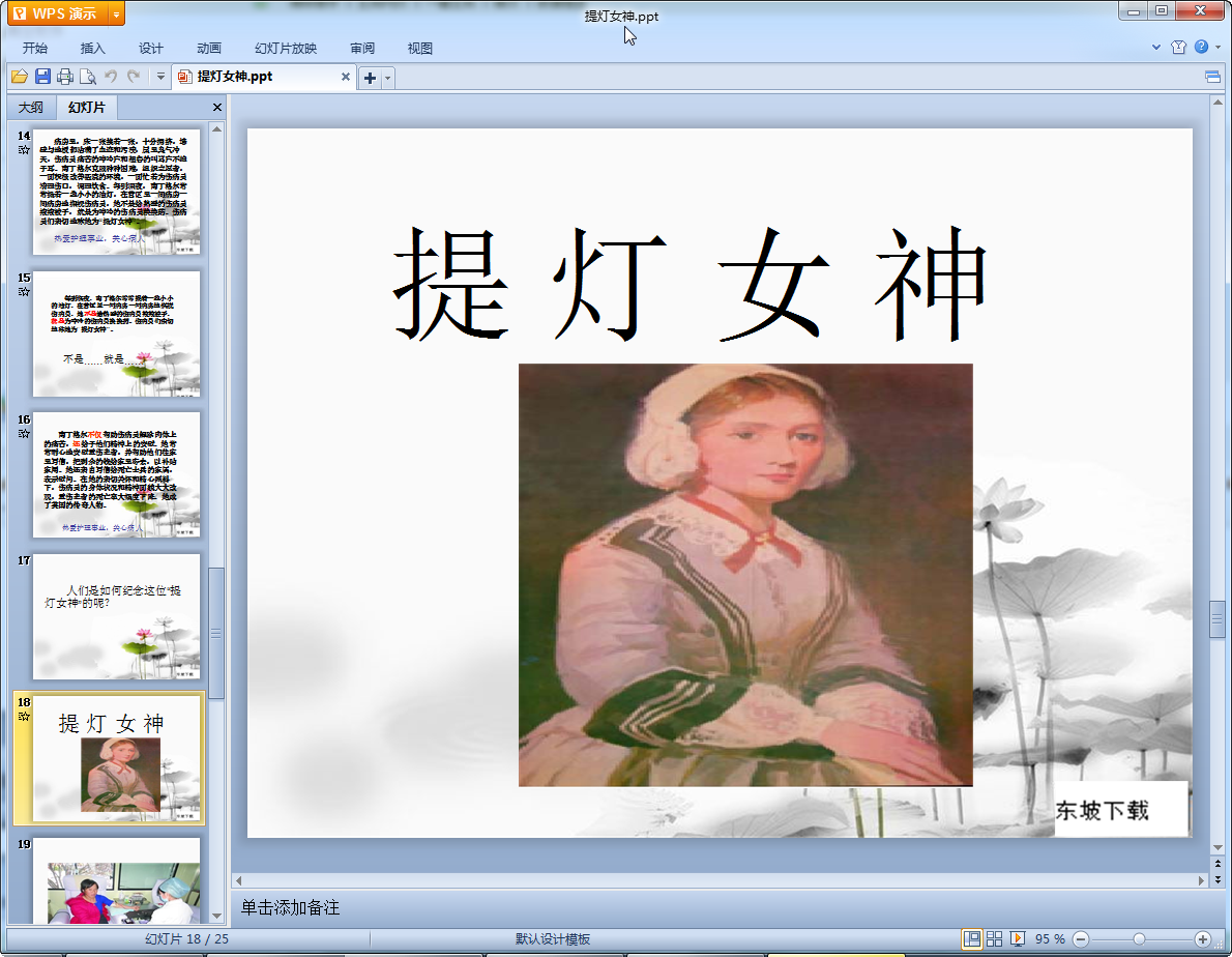这里是一篇六年级的语文课件提灯女神ppt,课文介绍南丁格尔从小的经历,该课件共有25页内容制作精美,对课文中的知识点归纳讲解十分清楚,对该课件有兴趣的老师们可以来这边免费的下载使用!