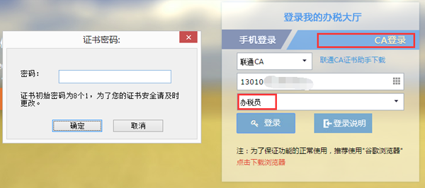 选择"CA登录"->"联通CA";输入单位税号,选择登录身份,在提示框里输入密码,点击确定即可,初始密码都是11111111;如图所示: