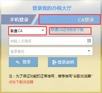 访问河北网上办税服务厅,点击"CA登录",选择"联通CA",点击"联通CA证书助手下载",如下图所示: