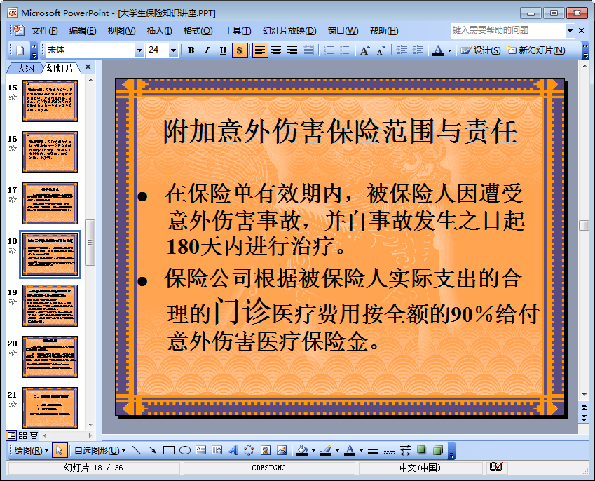 作为一名大学生,你知道保险的作用吗?你了解保险的含义吗?你知道保险中关于意外伤害的界定吗?如果你的回答是否定的,那么就赶紧随小编一起来看看这份大学生保险知识讲座ppt课件吧!——一份并不是给你洗脑让你买保险、只是想告诉你一些保险知识的ppt,大学生朋友们速度关注起来吧!
