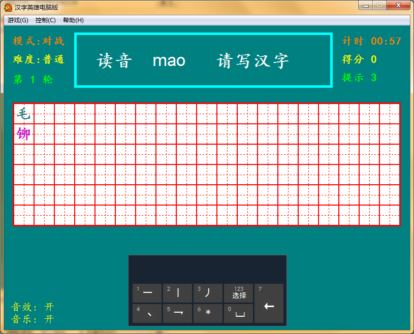 汉字英雄电脑游戏是一个绿色版根据拼音写汉字的汉字游戏。该版是手机版汉字英雄的升级版,游戏规则为根据一个拼音写出该读音的所有文字,所填汉字范围为常用简体中文汉字(GB2312字库,6600左右),不包括繁体字。游戏提供有笔画输入法,输入速度完全OK,任何人都会使用,任何人都会玩。