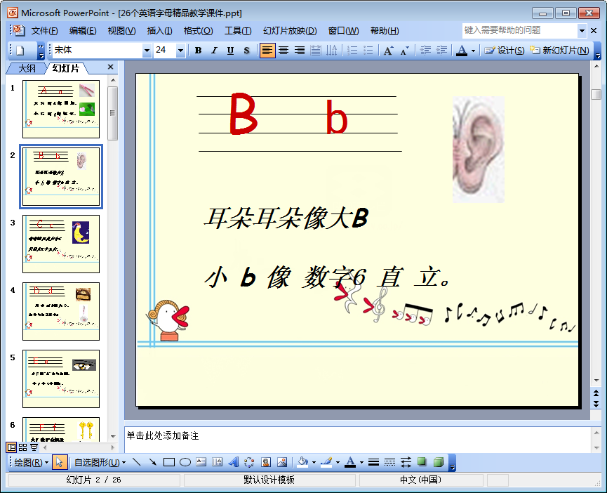 这是一份充满趣味性的26个英语字母精品教学课件ppt(以下简称为26个英语字母教学ppt),该ppt共26页,ppt模板清爽整洁、内容全面完整,是一份备受小学低年级老师们推崇的26个英语字母教学ppt,如果你需要这份ppt作为教学资料的话,那就快来东坡下载吧!