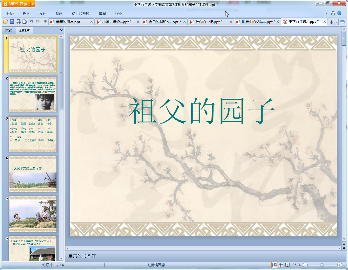 这是我们东坡下载编辑整理的祖父的园子教学课件,该课件共有14页制作十分精美,对文章中的内容讲解十分详细,课堂上对学生们有足够的吸引力,非常不错的教学课件,感兴趣的老师们可以免费的下载使用!